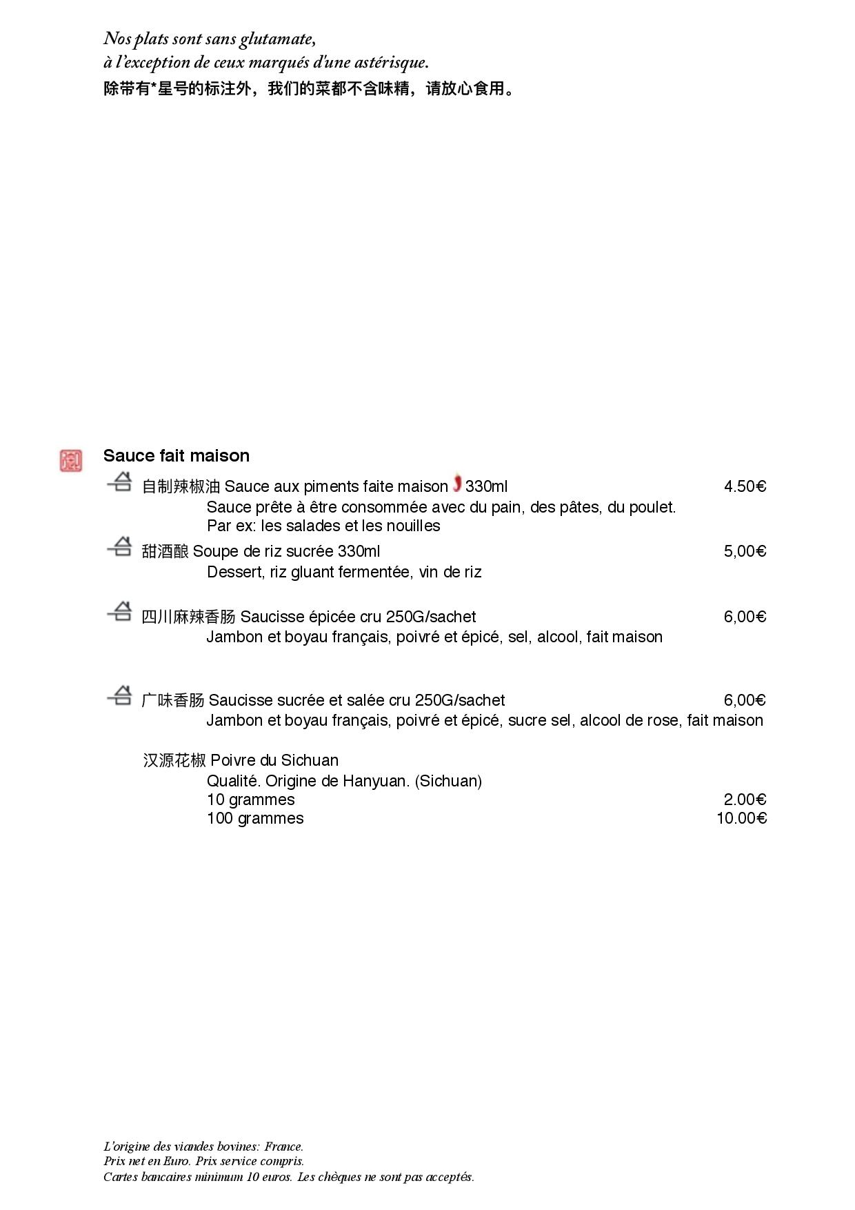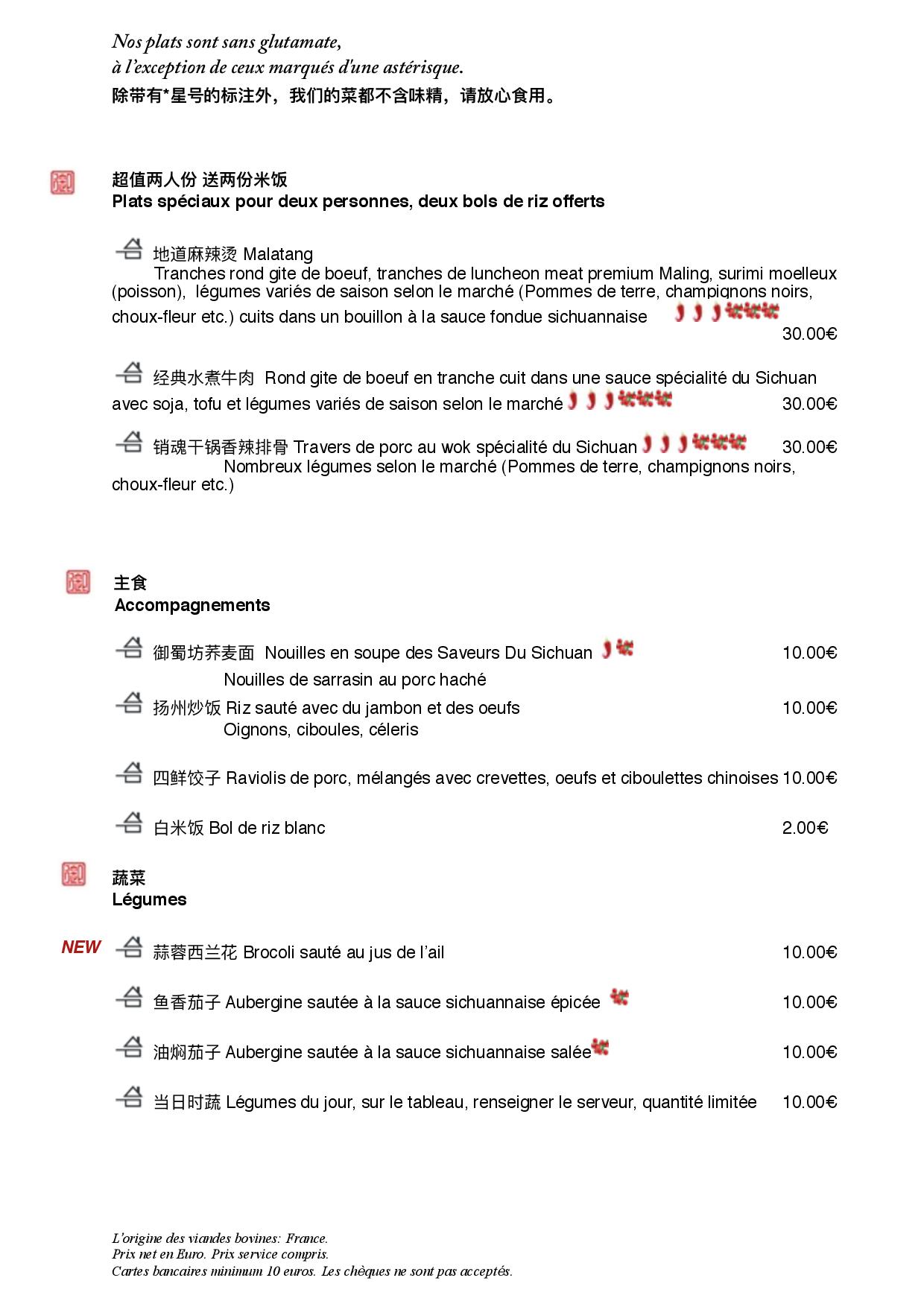 Accueil très chaleureux, avec le sourire et on vous met tout de suite à l'aise. Carte élaborée par l'ancien chef d'un restaurant étoilé de Chengdu (capitale de la région Sichuan en Chine), d'où la parfaite maîtrise des spécialités régionales. Absolument essayer le MAPO TOFU, très représentatif de ce type de cuisine grâce à l'utilisation de poivre et autres épicés locales. Très belle sélection de vins pour tous les budgets.
