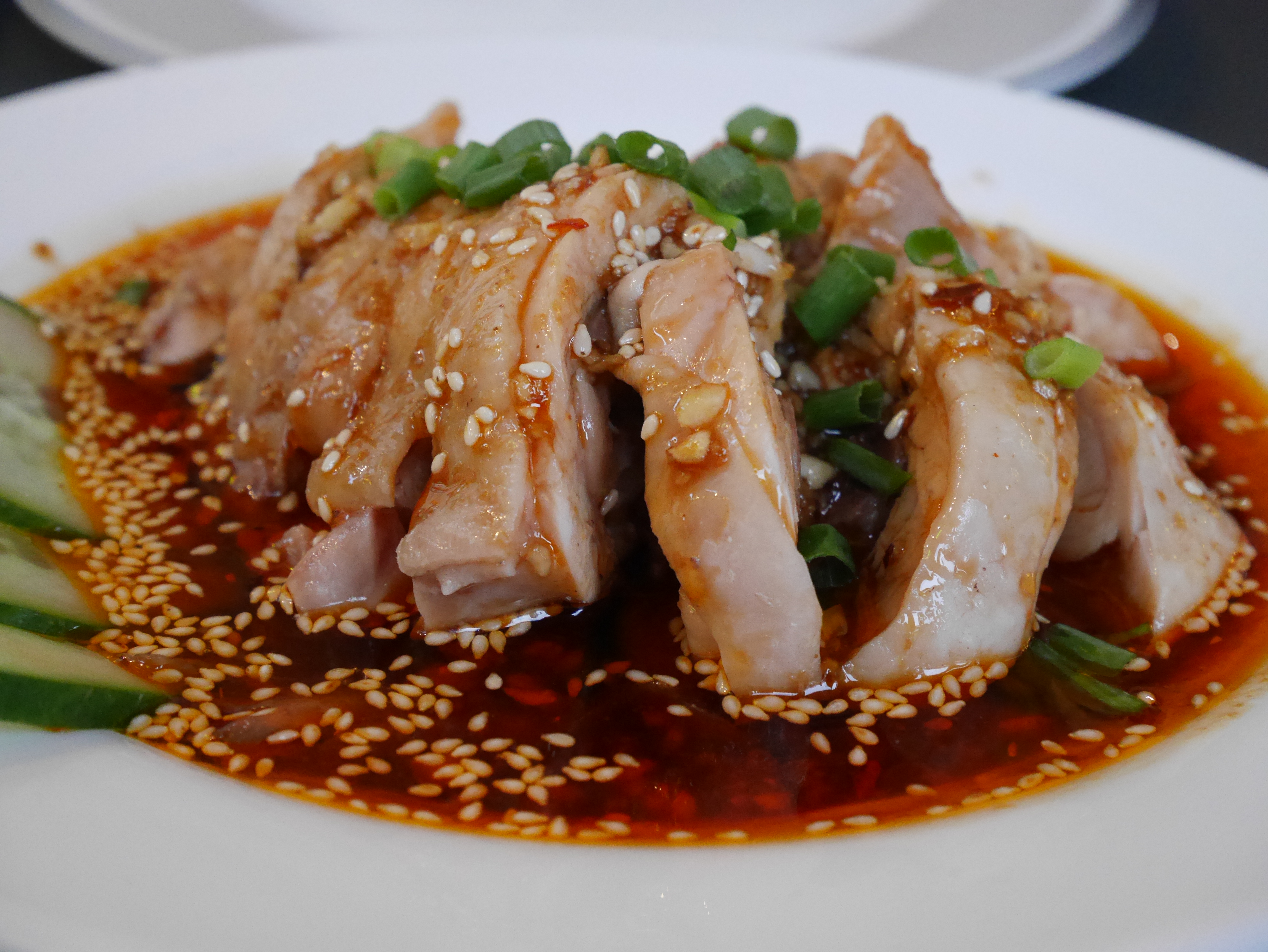 Le restaurant est plutôt vaste. Il était tristement vide à notre arrivée pour déjeuner mais s'est finalement vite rempli. La déco fait un peu chic suranné mais le service est avenant. Comme son nom l'indique, les spécialités servies ici sont celles de la province chinoise du Sichuan, en général assez pimentée. Tout ce que nous avons commandé était ici bien dosé et bon : le saucisson fait maison, le bœuf séché, les raviolis, les aubergines. Même les desserts étaient agréables, ce qui n'est pas toujours le cas dans la cuisine chinoise : la typique gelée Guilinggao ainsi qu'un gâteau maison. Une bonne adresse.