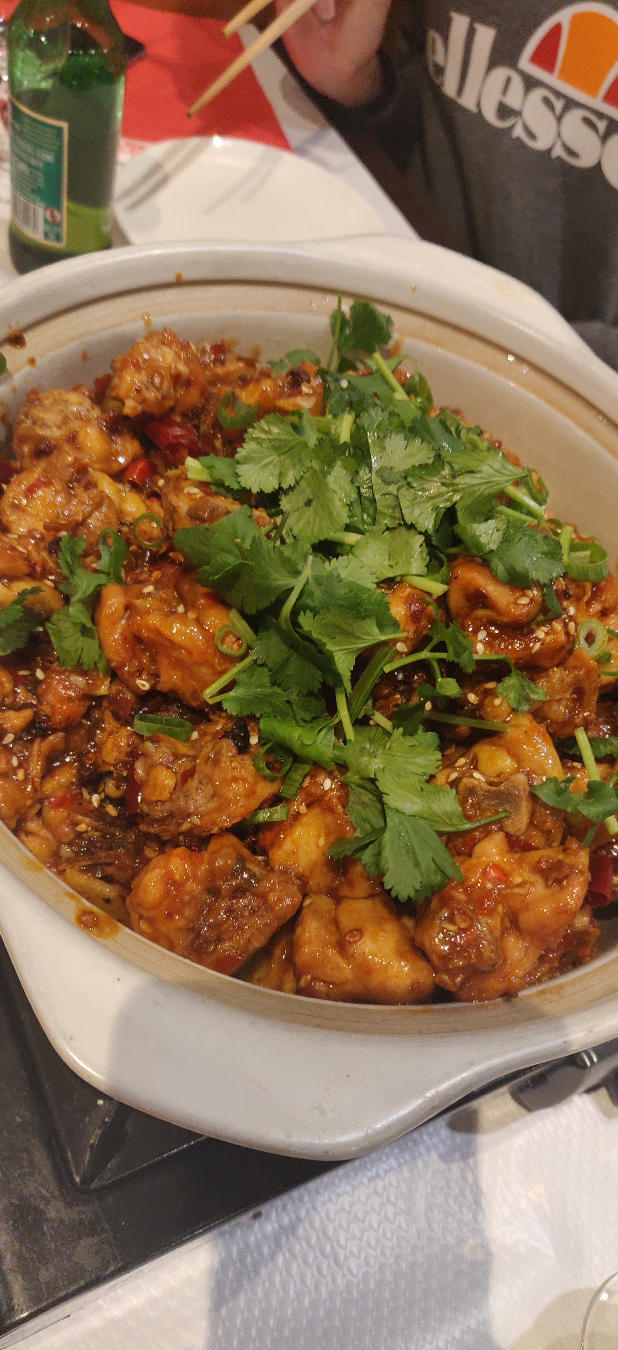 La portion est grande, très bien pour le dîner Poulet rôti de Chongqing. Le poulet est coupé en très petits morceaux. Il est très difficile d'enlever les os en mangeant. A part ça tout va bien