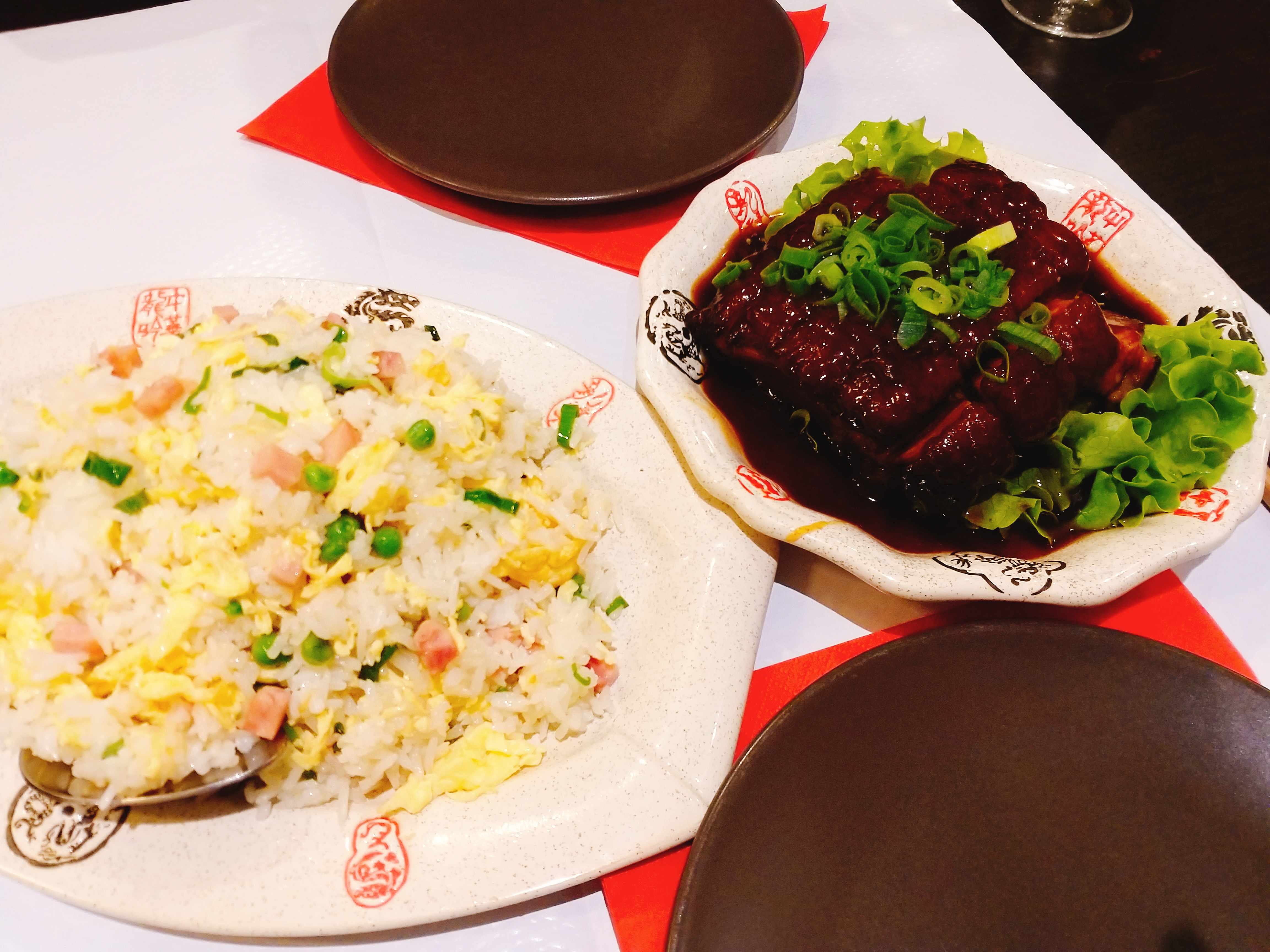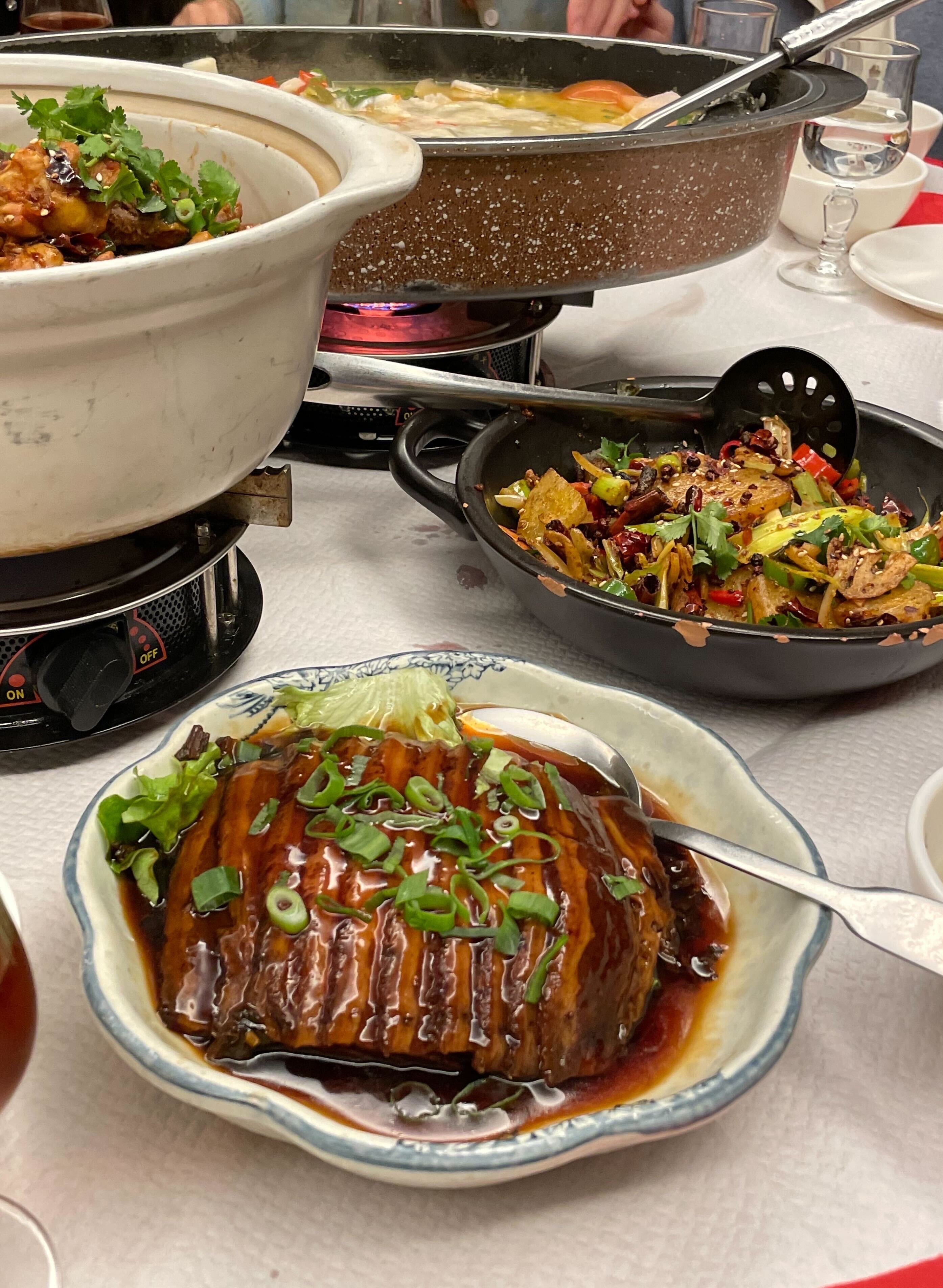 Vraiment excellent. Les portions sont généreuses (1 plat par personne suffit largement, vous pouvez prendre plus pour emporter le reste.) Pour information, les plats avec un ou deux symboles piments sont tout à fait bon pour des gens qui ne mangent jamais de plats piquants. Le porc dongpo est très bon, mais très gras. Je conseille de le prendre avec d'autres plats comme accompagnement.