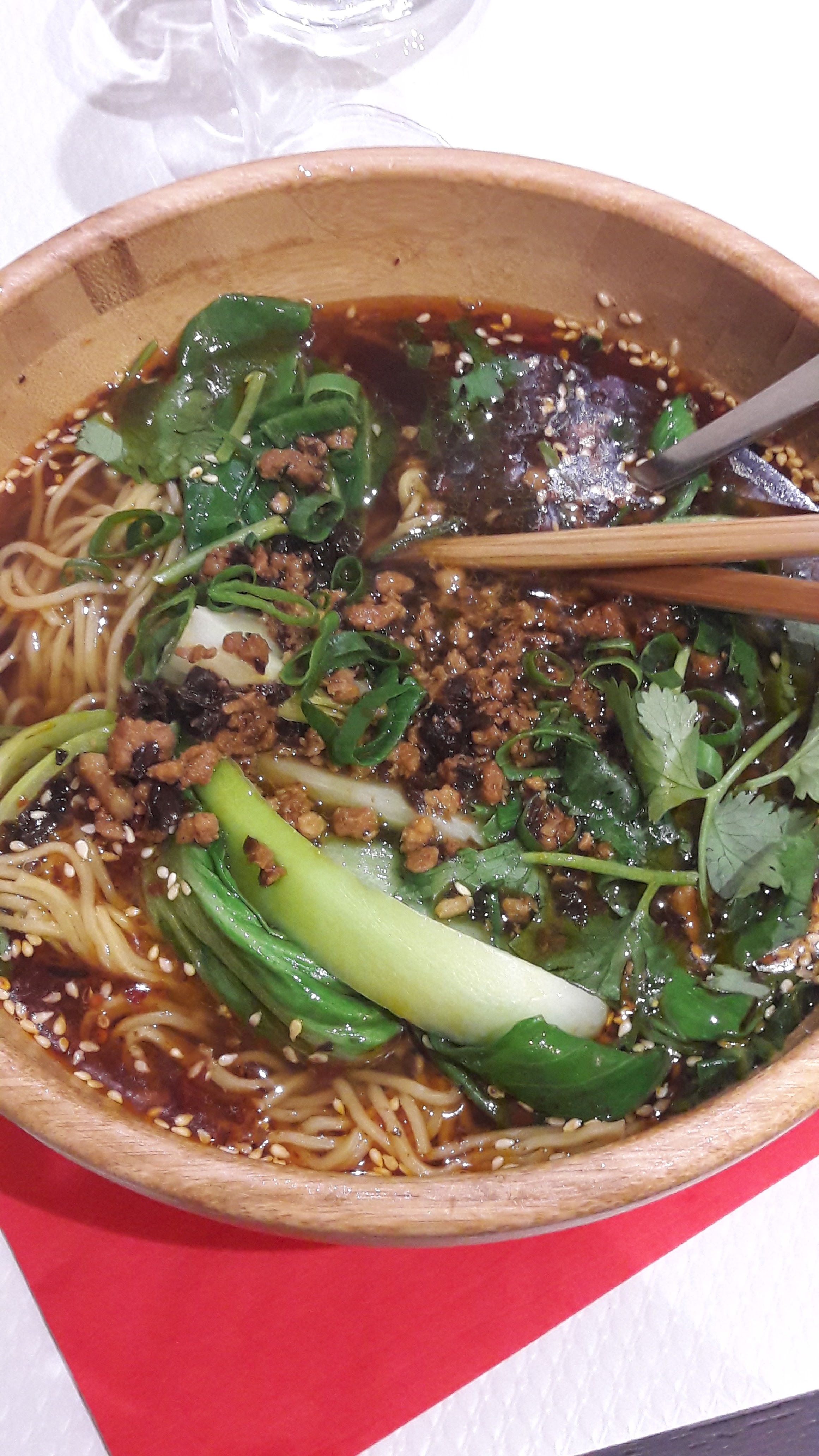 Nous avions envie de goûter un plat que nous n'avions jamais goûté auparavant. Mais c'était un peu trop épicé pour nous (même si nous avons obtenu le niveau 1 d'épicé). Les boulettes étaient incroyables! Nous étions assis à la table avec des personnes au hasard, ce qui est une bonne chose si vous voulez connaître quelqu'un de nouveau. Je reconnais que ce n’est pas quelque chose que tout le monde apprécie. La dame à l'entrée était gentille. Service ok et prix ok.